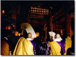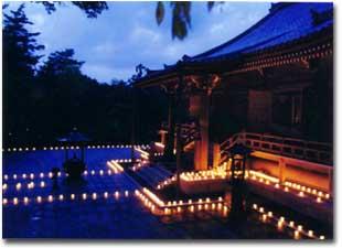 千灯会 (本堂前庭) 8月15日、午前10時より盂蘭盆会が、午後6時半からは千灯会が厳修されます。 境内に荘厳された数千灯の輝きが美しく、幽玄世界が現出します。 三界万霊・諸精霊等を供養する光の海は、「至心の祈りは必ず通じる」との思いをあらたにさせます。 |
