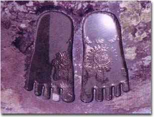 仏足石 「仏足石」はお釈迦様(仏陀)の足の裏の形を石に彫ったものです。 お釈迦様がそこに立っている標幟とされて、これを礼拝すれば生身のお釈迦様を拝むのに等しいといわれています。 この「仏足石」は元治元年(1864)の作とされ、形の良さで全国の仏足石の中で屈指の名品の一つとして有名です。 |