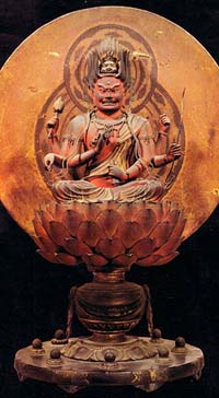 愛染明王坐像 わずか一尺ばかり(31.8cm)の小像であるが、愛染堂の秘仏本尊として大切に祀られているためか、衣紋の截金や深紅の彩色が鮮やかに残っている。 先年、像内からは木造六角幢形の容器に入った金銀製舎利容器や、この像の本軌である瑜伽瑜祇経(ゆがゆぎきょう)、造立願文(ぞうりゅうがんもん)などが発見された。 それらによると、この像は宝治元年(1247) に叡尊が願主となり、仏法興隆の念持仏として仏師善円が造ったものであることが分かった。 この愛染明王象は、寺伝によると弘安四年(1281)の元寇の役(13世紀後半に起こった蒙古襲来の事変)に際して叡尊が祈祷した愛染尊勝法の本尊であり、その祈願の最終日の夜には、明王が持つ鏑矢が妙音を発して西に飛び、敵を敗退させたという。 これにちなんで、近世(宝暦四年)にこの像が江戸回向院に出開帳された時、2代目団十郎が中村座で「矢の銀五郎」を上演し、また鳥居清信(江戸時代の浮世絵画家)が描いて奉納した絵馬が当寺に現存する。 |