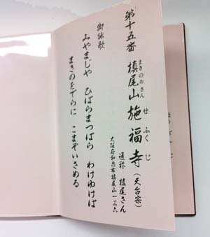 | 西国愛染霊場めぐりの専用朱印帳には各札所寺院のご詠歌が記載されています。 それぞれポケット形式になっていますので、各寺院ではご参拝の後、 愛染霊場めぐり専用の朱印用紙(500円)をいただき、 各霊場ページのポケット部分に挿入してください。 ![]() 内表紙には愛染明王様の御影と札所寺院の住所、御詠歌が記載されています。 ※初回購入時のお寺では2,000円+朱印代500円=2,500円となります。 ※令和6年10月1日より 愛染霊場のご朱印は500円となります。 |